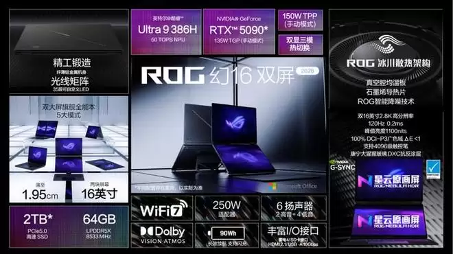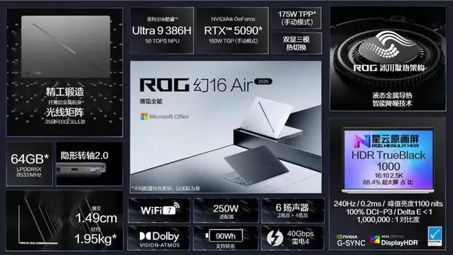 具备大屏专业创作属性的ROG幻16Air2026同样迎来全面升级。其搭载酷睿Ultra9386H处理器与至高RTX5090笔记本电脑GPU,并采用全新升级的冰川散热架构,使整机核心功耗释放提升到至高175W,性能更为强悍。同时机身依旧保持了约1.95kg重、1.49cm薄的出色便携性。屏幕上,其16英寸ROG星云原画屏具备2.5K分辨率、240Hz刷新率、0.2ms疾速响应等顶级参数,峰值亮度达1100nits,通过了VESADisplayHDRTrueBlack1000认证,出厂校色支持色域切换,为专业工作流提供了更沉浸、更流畅、更高素质的视觉体验。