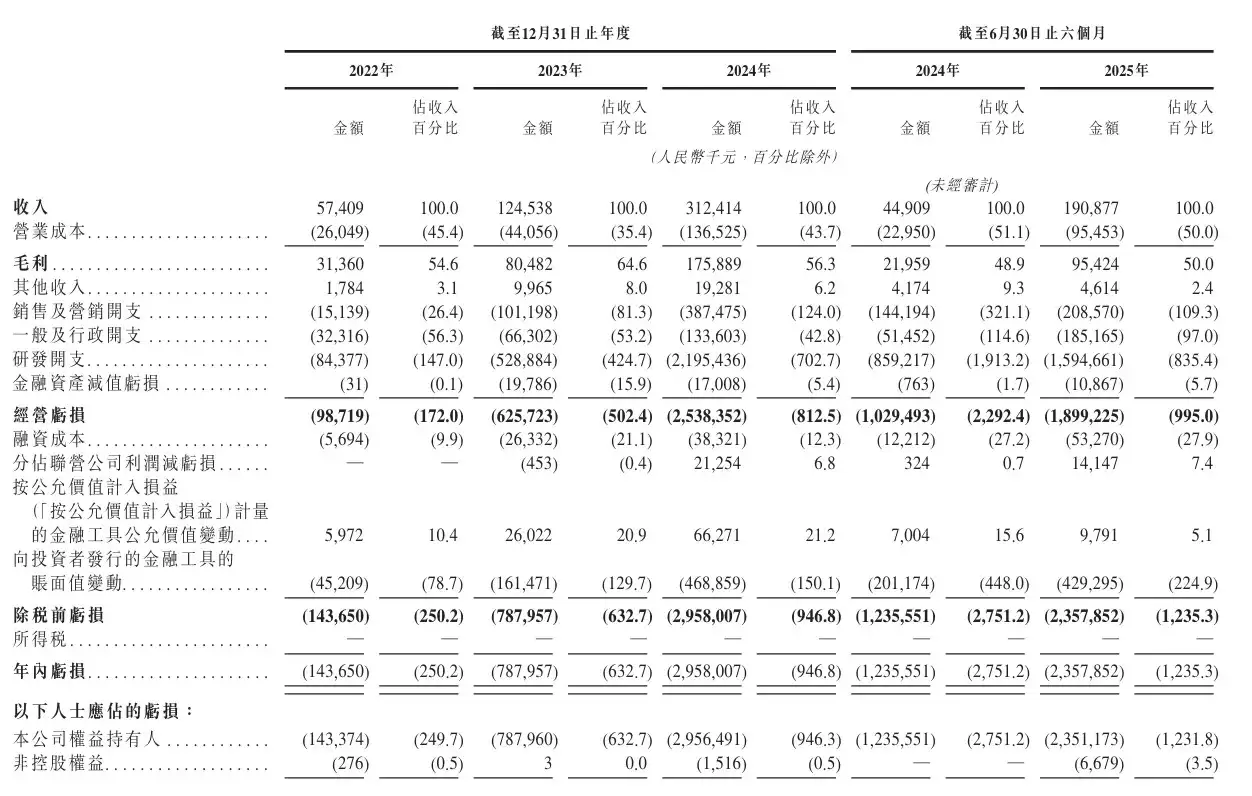 2025年上半年,智谱AI的营收达到1.91亿元,上年同期为4491万元。公司目前仍处于投入期,尚未实现盈利,主要原因是高昂的研发投入,累计研发费用高达约16亿元。2022年、2023年、2024年公司的研发投入分别为8440万元、5.289亿元、21.954亿元。2025年上半年研发投入为15.947亿元,累计研发总投入已超过44亿元。