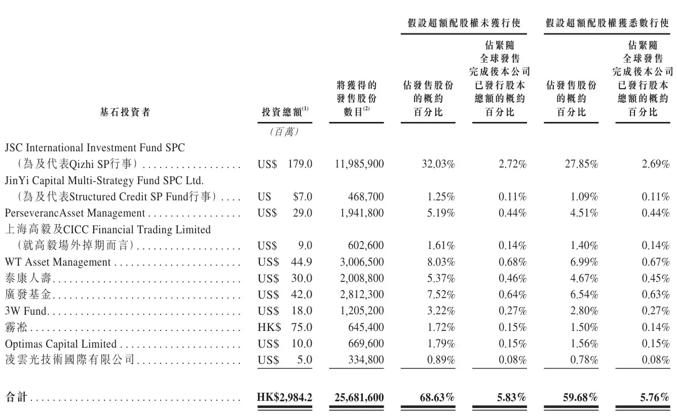 具体来看,基石投资者的认购情况为:JSC International Investment Fund SPC认购1.79亿美元,JinYi Capital Multi-Strategy Fund SPC Ltd认购700万美元,PerseverancAsset Management认购2900万美元,上海高毅认购900万美元,WT Asset Management认购4490万美元,泰康人寿认购3000万美元,广发基金认购4200万美元,3W Fund认购1800万美元,雾帜认购7500万美元,Optimas Capital Limited认购1000万美元,凌云光技术国际有限公司认购500万美元。