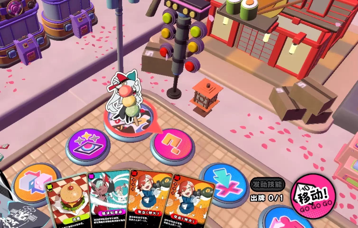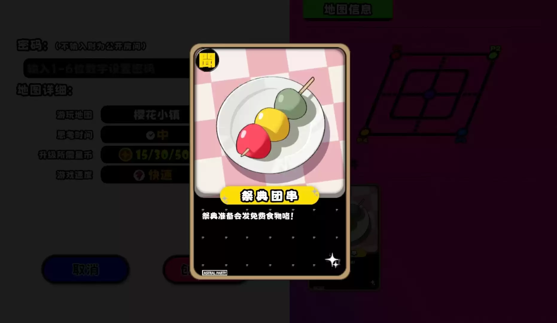 本张地图的特殊事件为“祭典团子”,它会随机散落到地图上的各个格子里。玩家路过它时不会触发任何效果,但若是在它所在的格子停留,除了能触发格子上的事件外,也能享受到它带来的各项福利,比如为自己回血等。所以玩家可在自身血量不是特别高的时候,主动选择团子较多的路线,利用它为自己补充血量,节省手里的加血卡牌。相对的,大家可以多拿一些攻击卡牌,用它们来将对手打入昏迷,同时手里也要保留些反制牌,比如将他人对自己的攻击转移给别的对手等。