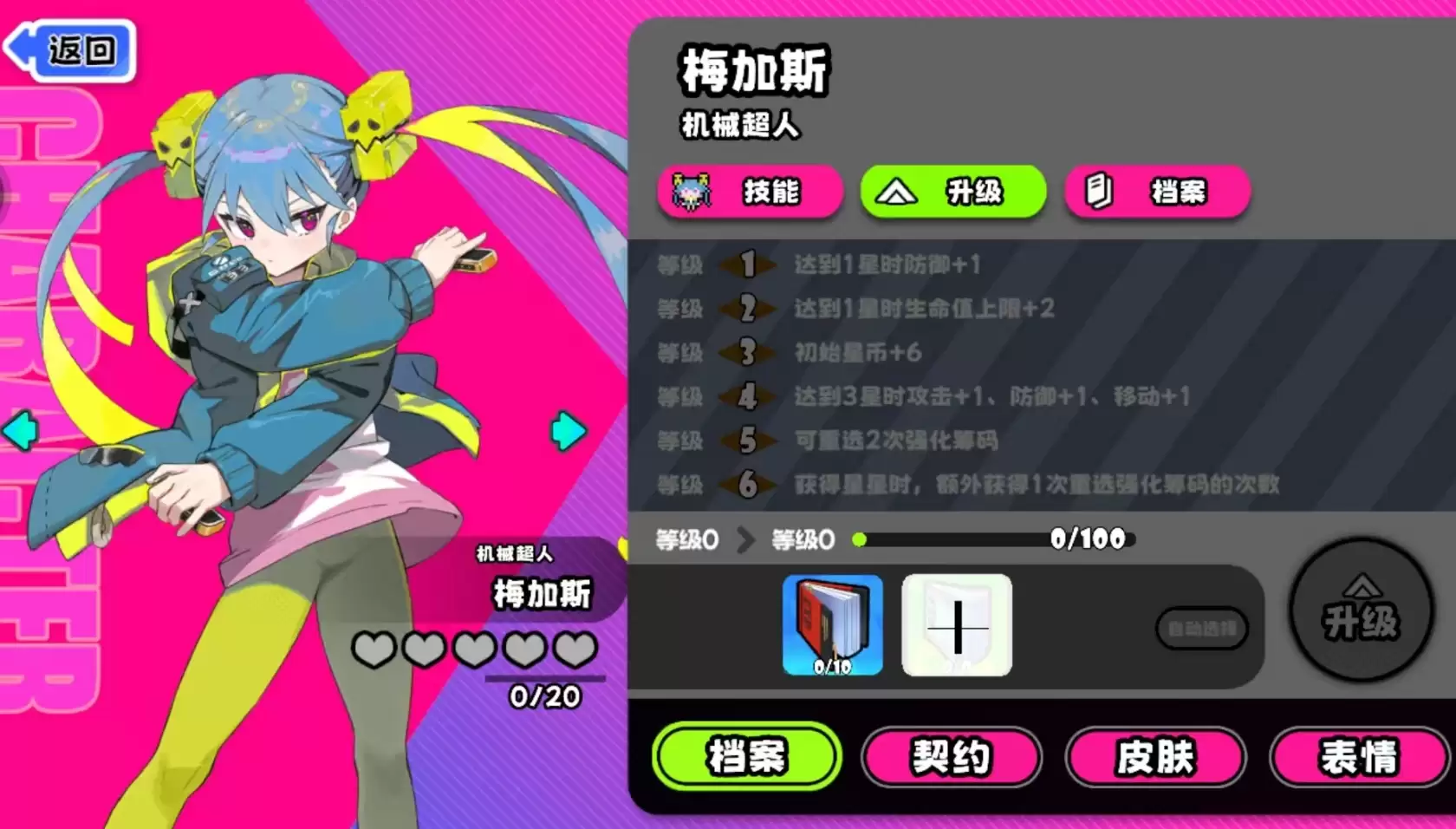 值得注意的是,梅加斯缺乏攻击力成长路径,升级带来的基础攻击增幅微乎其微。面对高血量的Boss或精英单位时,仅2点单次伤害难以构成实质威胁。因此,在合作模式中更推荐将其定位为功能性辅助:专注星币获取、资源调度及生存支援,例如通过技能联动为队友创造安全输出环境,或利用自身生存强化属性延长队伍整体续航能力。其升级路线也明显倾向于星币收益提升与生命值加成,而非纯粹输出强化。
