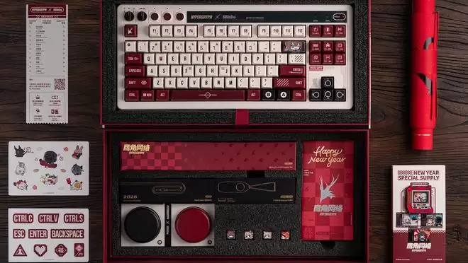 此次推出的新春套装内容丰富,包含一款联名版机械键盘本体、一个超大号回车按键、一支便捷拔键器、额外赠送的IP主题键帽、可替换的像素风街机造型冰箱贴、新春红包、文化贴纸以及一副迎春对联。