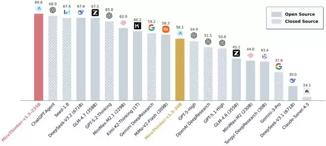 BrowseComp 基准测试的性能比较 |图片来源:MiroMind 正式