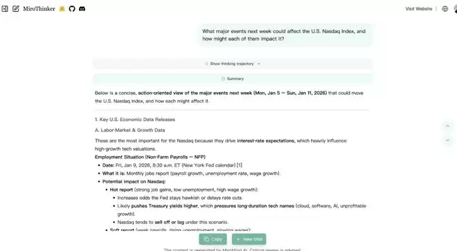 演示提问:下周有哪些重大事件可能会影响美国纳斯达克指数?|图片来源:MiroMind 正式