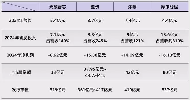 2024-2024年累计研发投入18.45亿元,研发投入占同期的营收比例均超140%,小于摩尔线程和沐曦(分别超过600%和250%)。