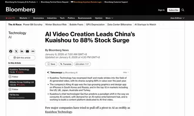根据Sensor Tower的数据,截至1月2日,快手的可灵AI应用是韩国和俄罗斯iPhone上收入最高的图形与设计类应用,并在美国、英国、日本、澳大利亚和土耳其等市场位列前十。彭博预计,2025年可灵AI的商业收入将达到1.4亿美元。随着可灵商业化和海外化扩展的进程逐步加快,市场对快手AI布局的预期也在升温,其股价在过去一年累计上涨88%,成为中国AI相关公司中备受关注的标的之一。