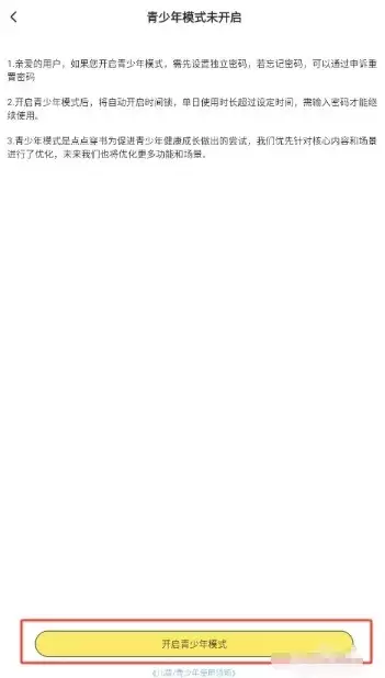接下来,您会看到该功能的介绍页面。请点击页面下方的“开启青少年模式”按钮。