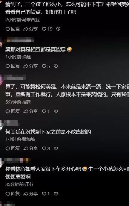 毕竟两人有3个孩子,何美延自己又没有赚钱能力,怎么可能会离婚?