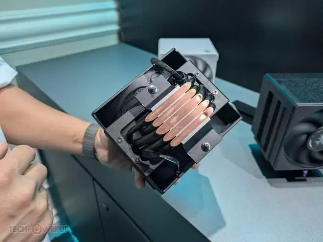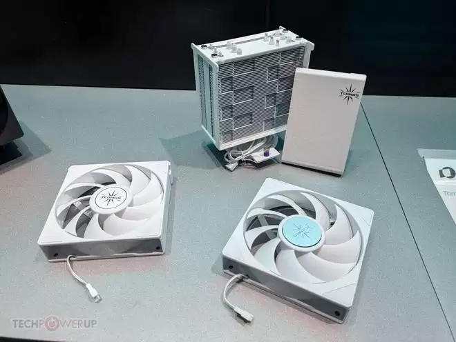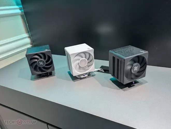 在风冷散热器领域,钛钽展示了最新的AS670和AS570系列。与去年带有LCD屏幕的AF620不同,今年的AS系列回归了纯粹的性能美学。两款散热器的顶盖采用了干净利落的平板设计,没有屏幕的干扰,显得更加沉稳内敛。该系列提供了全黑、全白和灰色三种配色,适配各种装机风格。作为双塔风冷,它们采用了双风扇推拉配置,风扇叶片经过特殊设计的“网状叶轮”处理,能够更有效地引导气流轴向流动,从而提升穿透散热鳍片的效率。