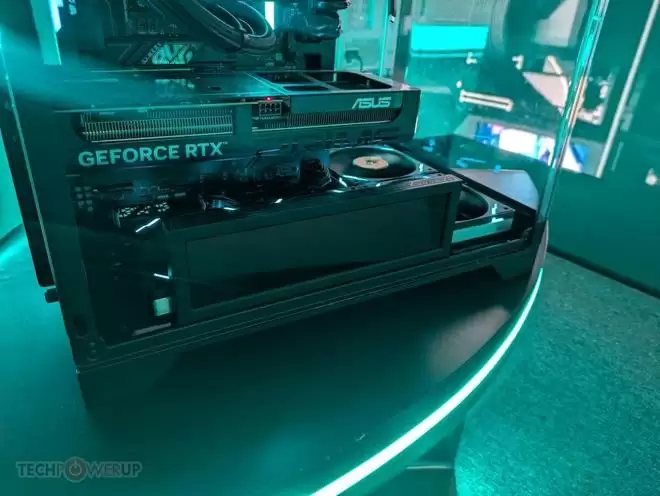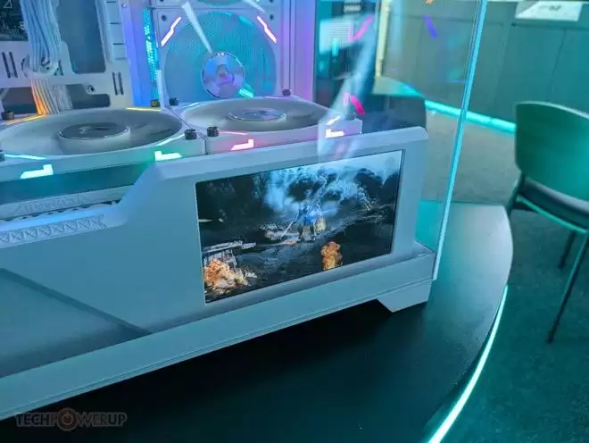 当然,这款机箱的主要亮点在于电源仓前侧稍微加高塞下一块7英寸、1024 x 600分辨率的IPS屏幕。同时电源仓顶部最大支持安装三把14cm风扇,进一步提升进风效率,保证良好的散热表现。