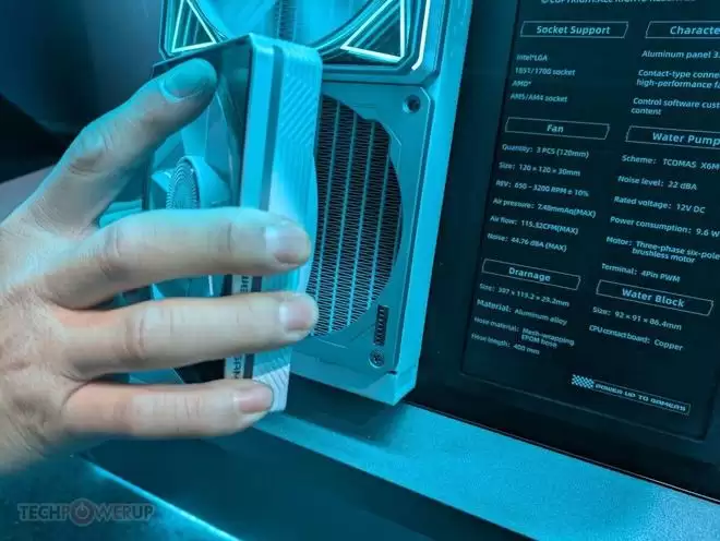 除了好玩的屏幕外,LX800 PRO最大的特点是三把模块化固定的风扇,所有风扇通过冷排上的支架固定,并通过8个触点来实现风扇的供电和控制。风扇整体可进行热插拔,同时支持正、反转切换。风扇尺寸为120×120×30mm,最高转速3200RPM,并能提供最大7.48mmH2O的静压和115.32CFM的风量,压制目前市面上的顶级处理器妥妥的。