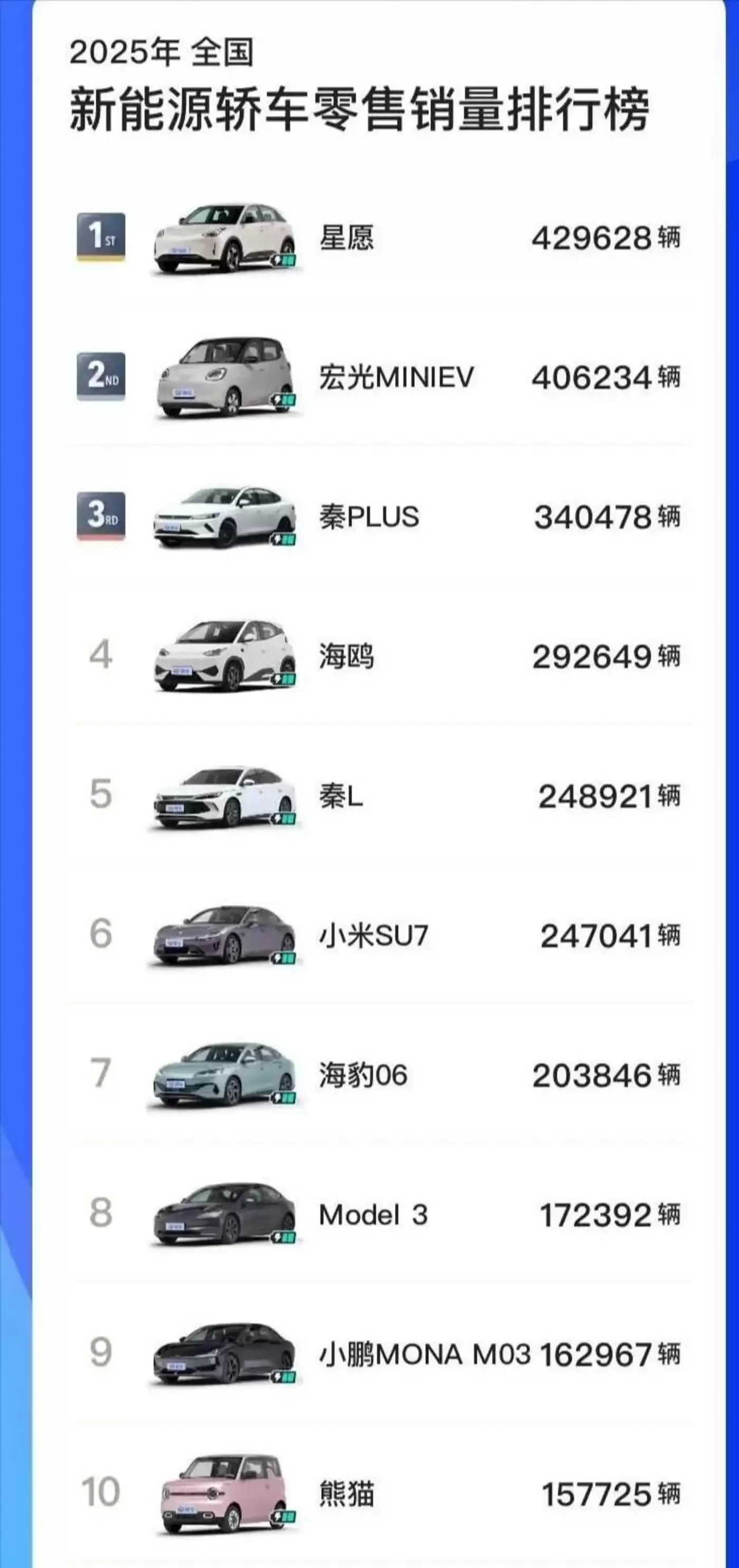 要知道,2025年的报废国补催生了几个超级爆款车型:吉利星愿,五菱宏光miniEV和比亚迪秦PLUS和海鸥。
