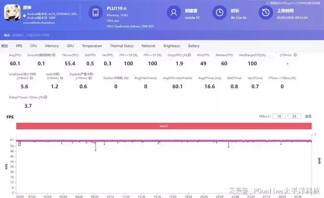 面对高负载的《原神》游戏,一加 Turbo 6同样表现出色。在最高画质下进行跑图测试,依旧能够保持稳定的帧率输出,且机身温度也控制得当,不会因过热而影响游戏体验。