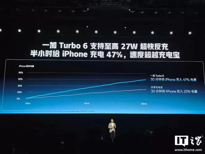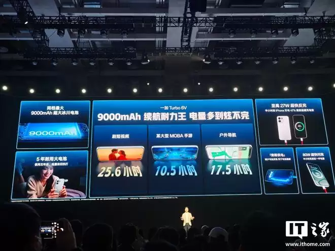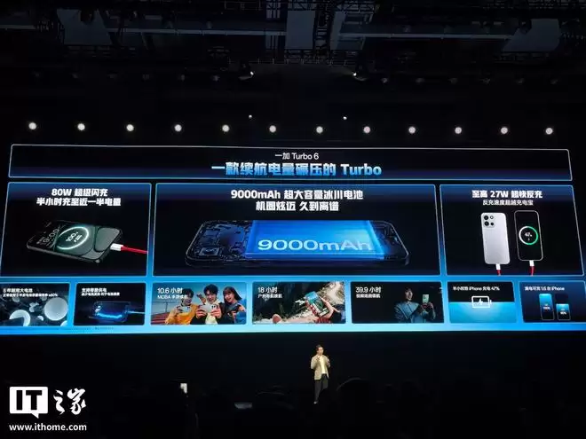一加 Turbo 6 系列搭载 9000mAh「超巨量」冰川电池,刷新 Turbo 档最大电池容量,实现“出门一天不带充电宝”,同时支持 80W 超级闪充与旁路充电技术。此外,一加 Turbo 6 系列支持最高 27W 有线反向快充,可随时为手机、耳机、手表等设备应急补电。半小时即可充满半部 iPhone。