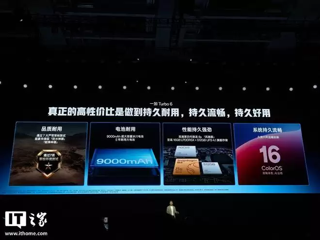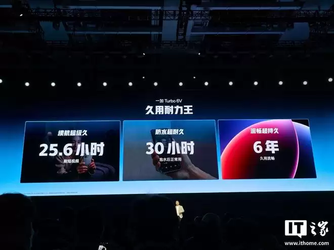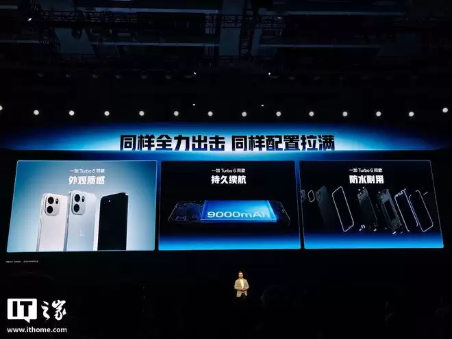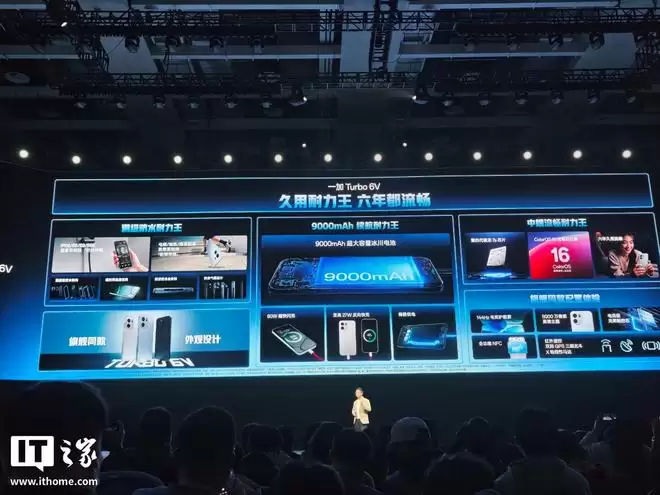 另外,本次发布会还带来了一加 Turbo 6V 手机,号称久用耐力王。该机继承一加 Turbo 6 同款外观质感,三种全新配色:新星白、无畏蓝、独行黑,搭载 Turbo 档最大 9000mAh 超大容量冰川电池,支持同档最顶级 IP66/68/69/69K 超豪华满级防水。