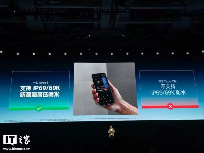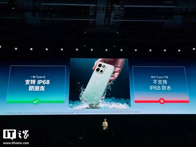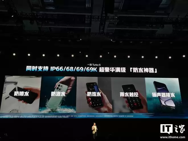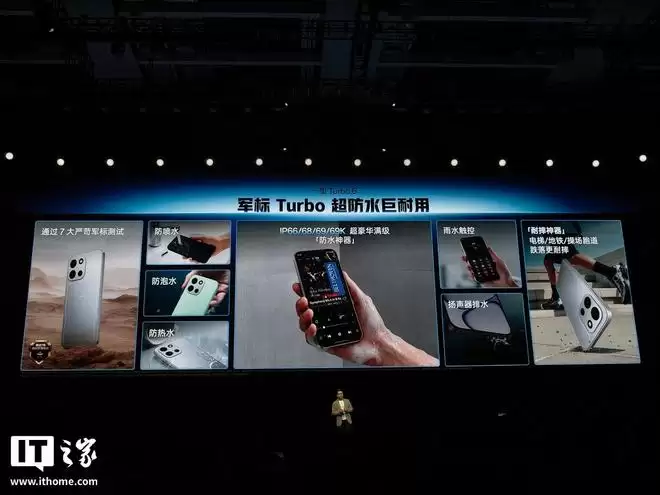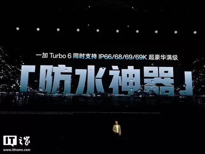 一加 Turbo 6 成功通过 7 大严苛军标测试,搭载旗舰级防水架构,全面支持 IP66/68/69/69K 满级防水的「防水神器」。同时,一加 Turbo 6 采用了旗舰级抗摔架构,屏幕覆盖超抗摔晶盾玻璃,耐摔性能提升 160%,支持 1.5 米高度防摔。