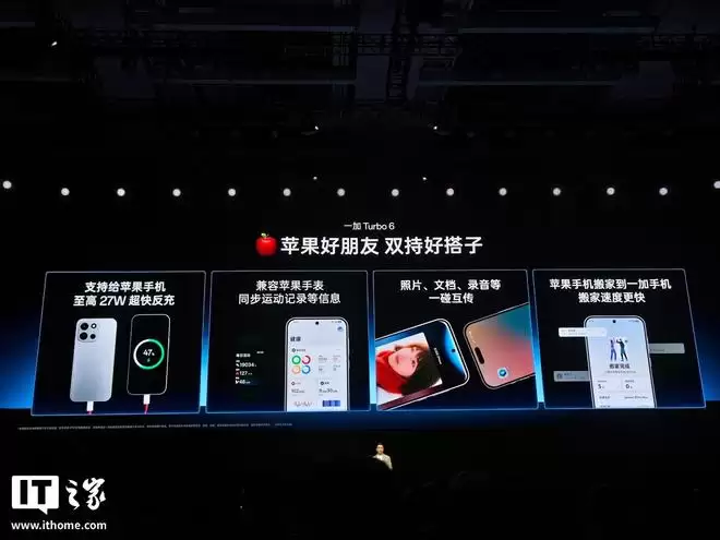 一加 Turbo 6 可为苹果手机提供最高 27W 有线反向快充,并支持原生级与 iPhone 生态的无缝互联,可实现通话共享、通知同步、一碰互传等,苹果用户熟悉的 AirPods、Apple Watch 也能完美适配兼容。