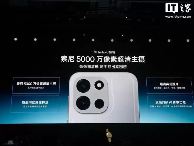 影像方面,一加 Turbo 6 搭载索尼 5000 万像素超清主摄,支持 OIS 光学防抖、超清实况照片、OPPO 旗舰级人像算法。同时,一加 Turbo 6 支持超清实况照片,并搭载 AI 修图功能,支持一键优化画面氛围等功能。