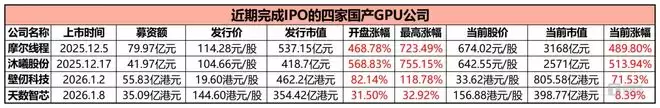 自去年12月5日“国产GPU第一股”摩尔线程在A股科创板上市至今,短短35天内,已有4家国产GPU公司相继在A股、港股完成IPO,接连引发抢筹,显示出市场对国产AI芯片的高关注度和高预期值。