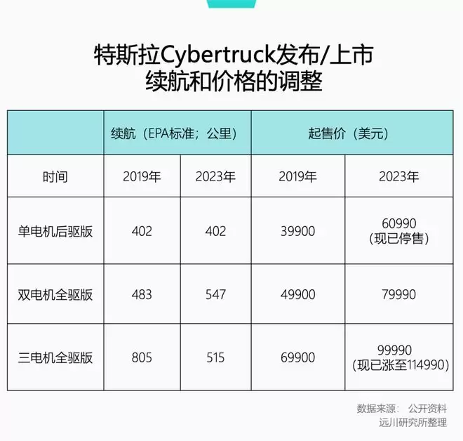 原因不难理解,2019年Cybertruck发布,马斯克给出的价格区间是3.9-6.9万美元,最高配的三电机全驱版EPA续航高达800km。
