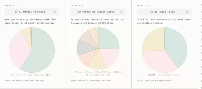 效率跃升的背后,是支撑性技术栈的激烈重构。报告以不同大模型提供商的SDK下载量为考察变量,发现在AI记忆模块中,mem0以59%市占率一骑绝尘;而对比向量数据库「六强混战」(Weaviate 25%领先,Chroma/Pinecone/Qdrant等紧咬)。