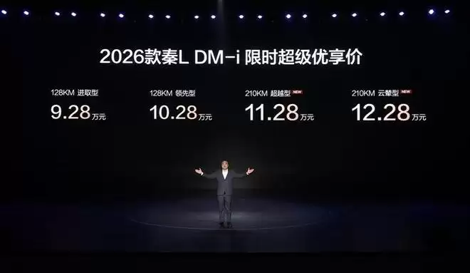 价格依然是发布会的核心,2026 款秦 L DM-i 的 210km 超越型售价为 11.68 万元,搭载云辇-C 的 210km 云辇行售价则为 12.68 万元,而入门的 128km 版本在享受购置税补贴后,起步价压到了 9.28 万元。