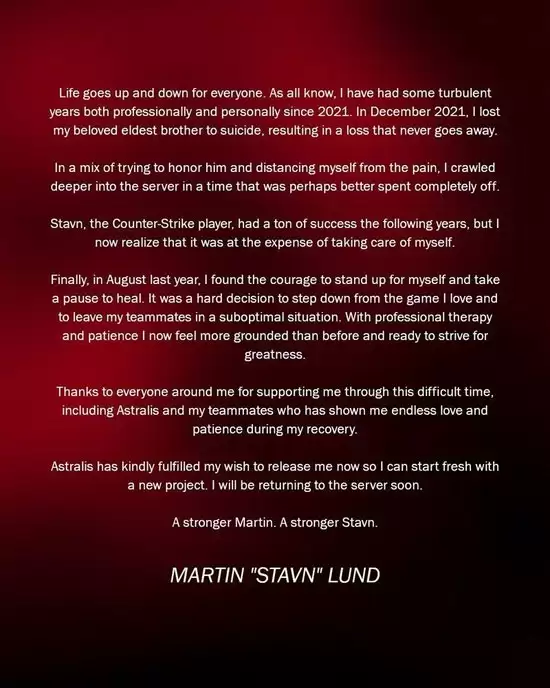 他在宣布回归的声明中详细说明了离场原因:“2024年12月,我挚爱的兄长因自杀离世,这份伤痛永远不会消逝。”stavn坦言,“当时我试图用赛场表现纪念他,将自己深深埋入训练之中,同时逃避痛苦,或许那段时光本该彻底休整。作为职业选手的stavn在随后几年取得了巨大成功,但我现在意识到,这是以透支自我为代价的。”