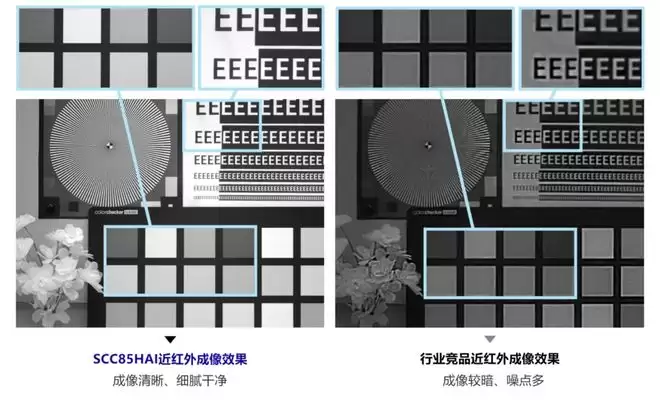 据介绍,SCC85HAI拥有5120H×3072V的超高分辨率,画面比例设计兼顾横纵方向冗余,同时支持16:9与4:3两种画面比例输出,适用于球机、鱼眼全景监控等多种安防监控设备。搭载Lightbox IR近红外增强技术,有效提升了可见光及近红外波段下的成像灵敏度。