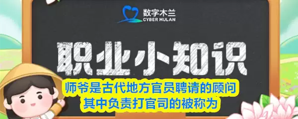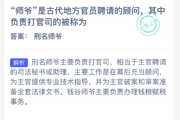 “师爷”是古代地方官员聘请的顾问,其中负责打官司的被称为什么?【蚂蚁新村每日一题】2026年1月8日题目已发布!坚持答题,积累木兰币,即可加速小镇建设。答对本题,立即可享“产速+3/时”的加速奖励!今天正确答案是【刑名师爷】。师爷是古代地方官员聘请的顾问,其中负责打官司的被称为刑名师爷。