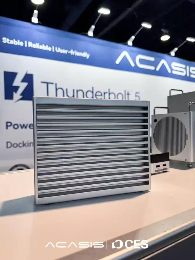 IT之家1月9日消息,国内硬件厂商ACASIS阿卡西斯在CES 2026展会上发布了全球首款支持四盘位雷电5接口的硬盘盒。