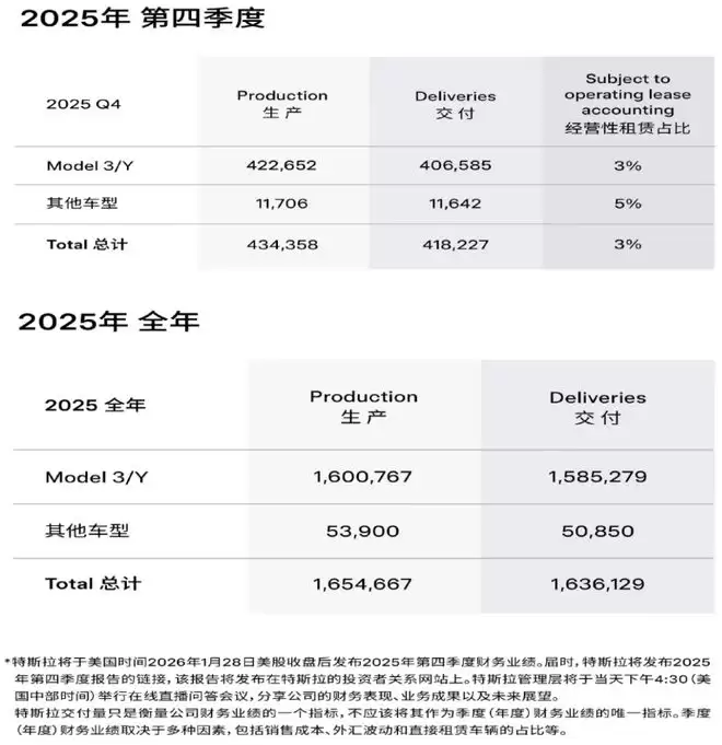 1月2日,特斯拉发布了2025年四季度和全年的汽车交付数据,两项数据均大幅下滑。数据显示,2025年第四季度,特斯拉新车交付量为418227辆,同比减少16%。从2025年全年来看,特斯拉新车交付量为163.6万辆,较2024年同期(178.9万辆)减少约15万辆,同比下降8.6%,这也是特斯拉连续第二年新车销售出现同比缩水。