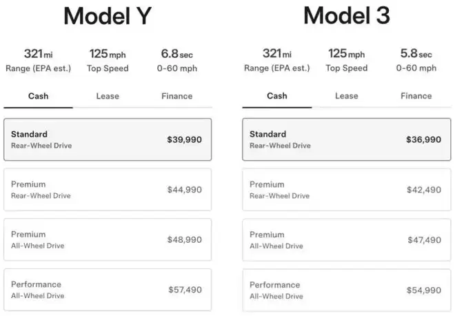 为了提振新车销量,特斯拉于2025年第四季度推出了多项新车优惠措施,并推出了低价版的Model Y和Model 3。2025年10月,特斯拉正式推出Model Y标准版和Model 3标准版两款新车型。从售价来看,标准版Model Y和Model 3的售价分别为39990美元和36990美元,较高级版分别降价约5000美元和5500美元,成为特斯拉有史以来定价最低的车型。