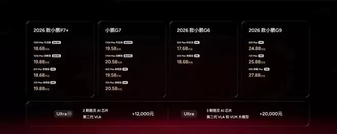 小鹏此次发布的四款车型形成了完善的产品矩阵。2026款小鹏P7+定位为全球纯电续航最长增程轿车,提供超级增程和纯电两种动力版本,售价18.68万元起。小鹏G7超级增程作为家庭SUV,以“超20项豪华舒适配置+越级空间”为核心亮点,后备厢基础容积高达779L,后排座椅放倒后可扩展至2237L。2026款小鹏G6和G9则通过“焕芯”升级,全系标配图灵AI芯片,提供从750TOPS到2250TOPS的三档智能进阶选择,满足不同消费者对智能辅助驾驶和座舱体验的需求。