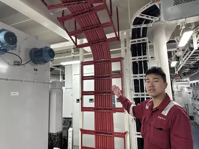 强大的电能需要通过专门的传输系统送达全船。全船拥有近550公里长的电缆,长度相当于北京到济南的直线距离,其中仅中压电缆就有190根。这些电缆直径约50毫米,是普通家用的30倍,专门用于输送6600伏的电能。
