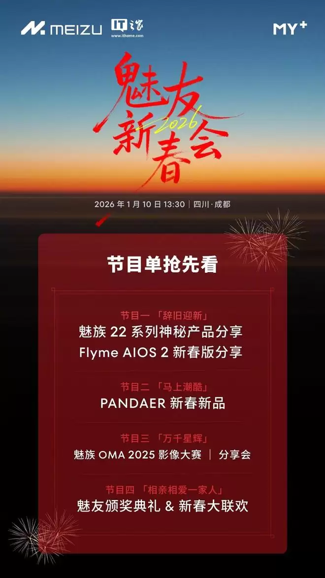 IT之家 1 月 9 日消息,魅族发文,宣布将于 2026 年 1 月 10 日(明天)13:30 举行 2026 魅友新春会,将推出魅族 22 系列神秘产品、PANDAER 新春新品。IT之家附最