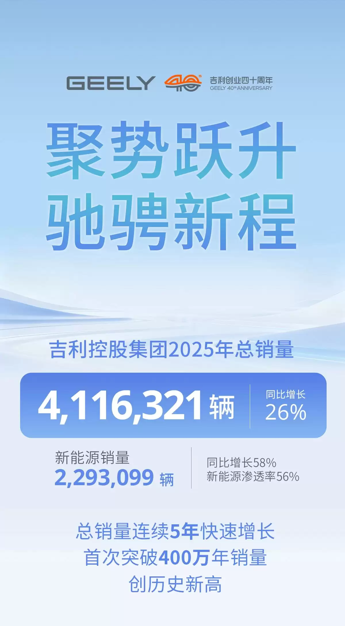 1月9日汽车行业传来消息,吉利控股集团公布2025年总销量达到4,116,321辆,较去年同期增长26%。其中新能源车型表现尤为亮眼,销量达2,293,099辆,同比增长58%;新能源渗透率提升至56%,集团总销量已连续五年保持快速增长,首次突破400万辆大关,创下历史新高。