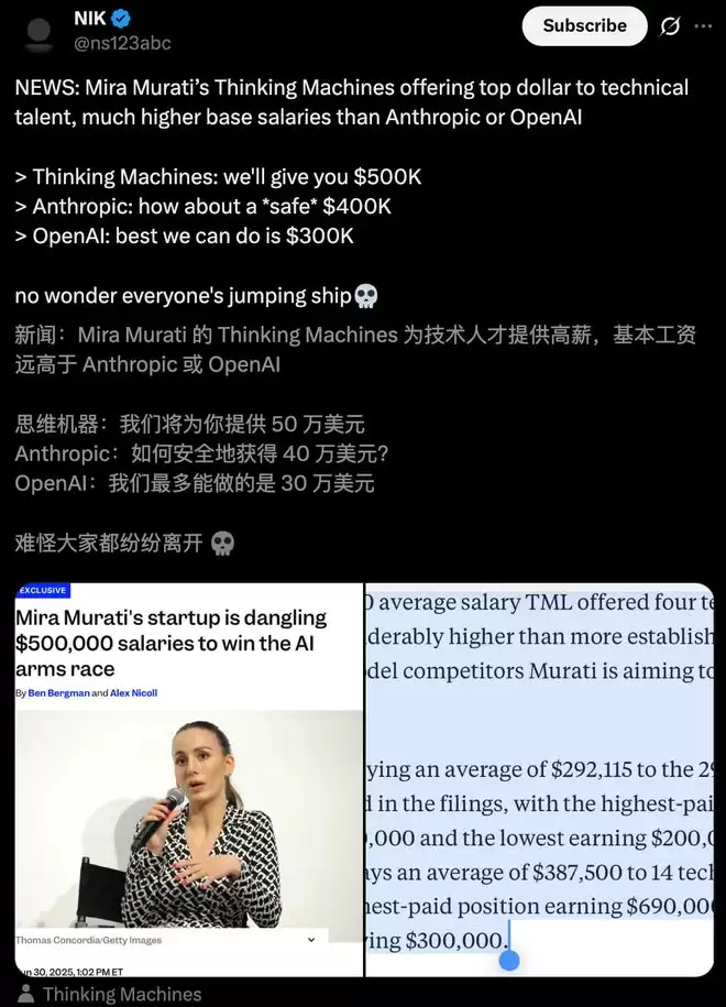去年,硅谷人才争夺战激烈,BI一篇独家挖到了Thinking Machines(TML)给员工们开出的薪资——
