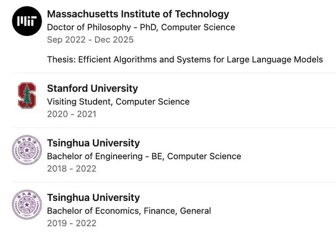 2024年,肖光烜加入MIT攻读博士学位,导师为韩松(Song Han)教授。
