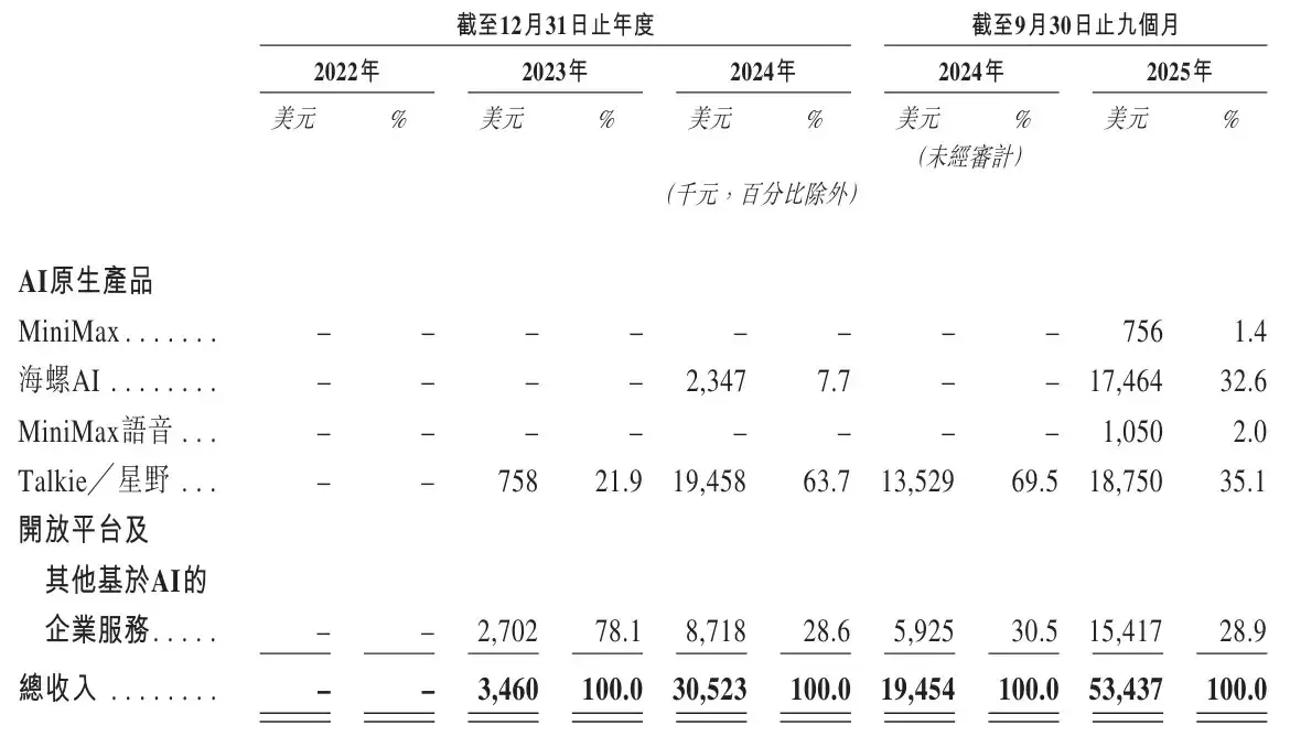 招股书显示,MiniMax在2023年营收为346万美元,2024年营收增长至3052万美元;2025年前九个月营收达到5343.7万美元(约合3.76亿元人民币),较上年同期的1945万美元大幅增长175%。