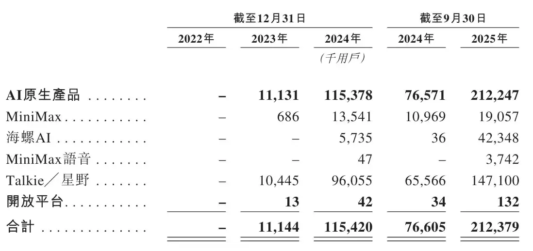MiniMax旗下AI原生产品的付费用户数量,从2023年约11.97万名增长至2024年约65.03万名,并在截至2025年9月30日的九个月进一步增至约177.16万名。
