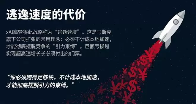 xAI的高管在电话会议里用了一个词叫“逃逸速度”。这是天体动力学的概念,马斯克经常拿来形容自己旗下公司的扩张节奏:你必须跑得足够快,不计成本地加速,才能彻底摆脱引力的束缚。