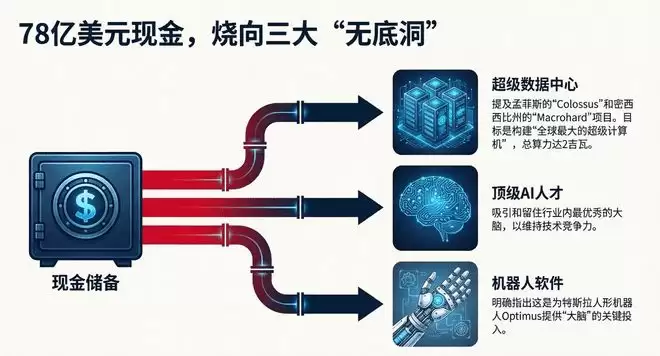 现金流方面更夸张:去年前九个月总共花出去78亿美元。这些钱并未凭空消失,而是被砸向了三个无底洞:超级数据中心、顶级AI人才,以及一个听起来很有未来范儿的“机器人软件”。