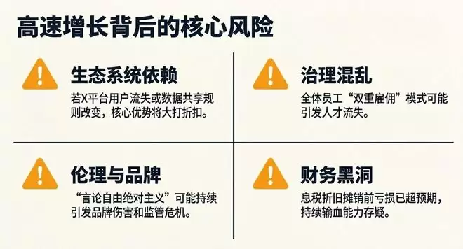 当然,这也带来风险。如果X平台用户活跃度下降,或者监管迫使数据共享规则改变,xAI的核心优势可能大打折扣。此外,xAI所有员工同时为X工作的“双重雇佣”模式,也被分析人士认为可能引发治理混乱和人才流失。