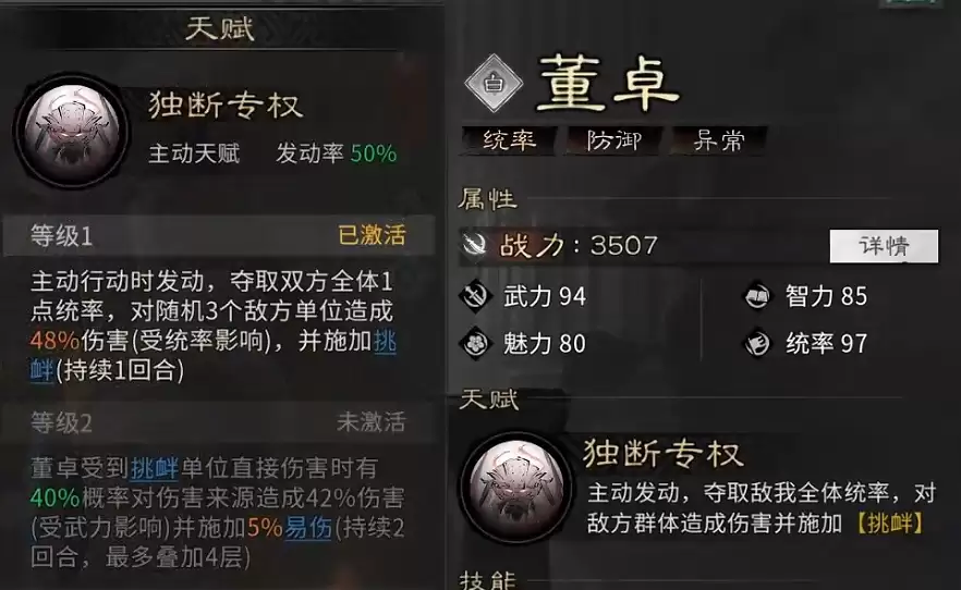 董卓的核心优势源自其独特的天赋体系。在主动行动时,他能同步夺取敌我双方统帅的属性,并对三名随机敌方单位造成伤害,同时施加挑拨状态。这一机制让他天然承担起前排诱敌的重任,有效保护后排的输出单位。当天赋升至二阶后,触发机制将进一步深化——每当被挑拨目标攻击董卓时,有概率反制并附加易伤效果,显著提升己方主力输出的伤害转化效率。因此,在实战布阵中,董卓通常部署于前排中央或侧翼,重点确保其追击技能覆盖到敌方C位武将。自身则无需刻意占据他人的追击路径,操作容错率高,上手门槛低。