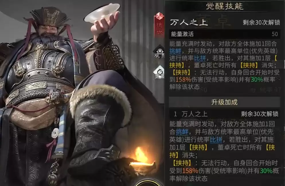 完成觉醒后,董卓的战术维度实现跃升。能量满时可对全体敌方施加挑拨。更关键的是,他将自动锁定敌方统率最高的单位发起“统率比拼”,胜出后令目标陷入“挟持”状态——该单位每回合初额外承受一次董卓伤害,且全程无法执行任何行动,直至效果解除。此控制链具备强持续性,配合天赋二阶的反制易伤,单回合内即可为多个目标叠加易伤,极大强化全队的爆发节奏,泛用性显著增强。