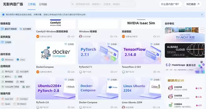无影AI云超算针对这些问题提供了一站式解决方案。其内置的镜像市场可以帮助用户快速切换所需开发环境,并提供多版本选择,实现“即开即用”。这样,科研人员、AI爱好者和创作者就可以专注于算法研发和创作本身,而无需为环境搭建和算力调配分心。
