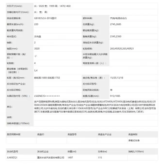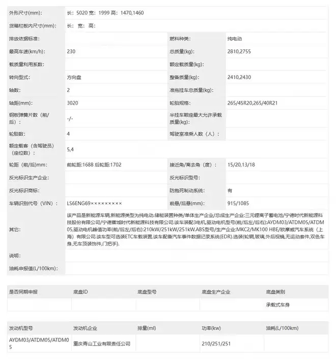 动力系统上,新车将提供增程式和纯电动两种版本。其中,纯电版提供三电机和双电机布局。三电机版本的前电机代号为AYDM03,最大功率为210千瓦,后部两台电机代号为ATDM05,每台最大功率为251千瓦。电池采用三元锂电池,最高车速可达230公里/小时。