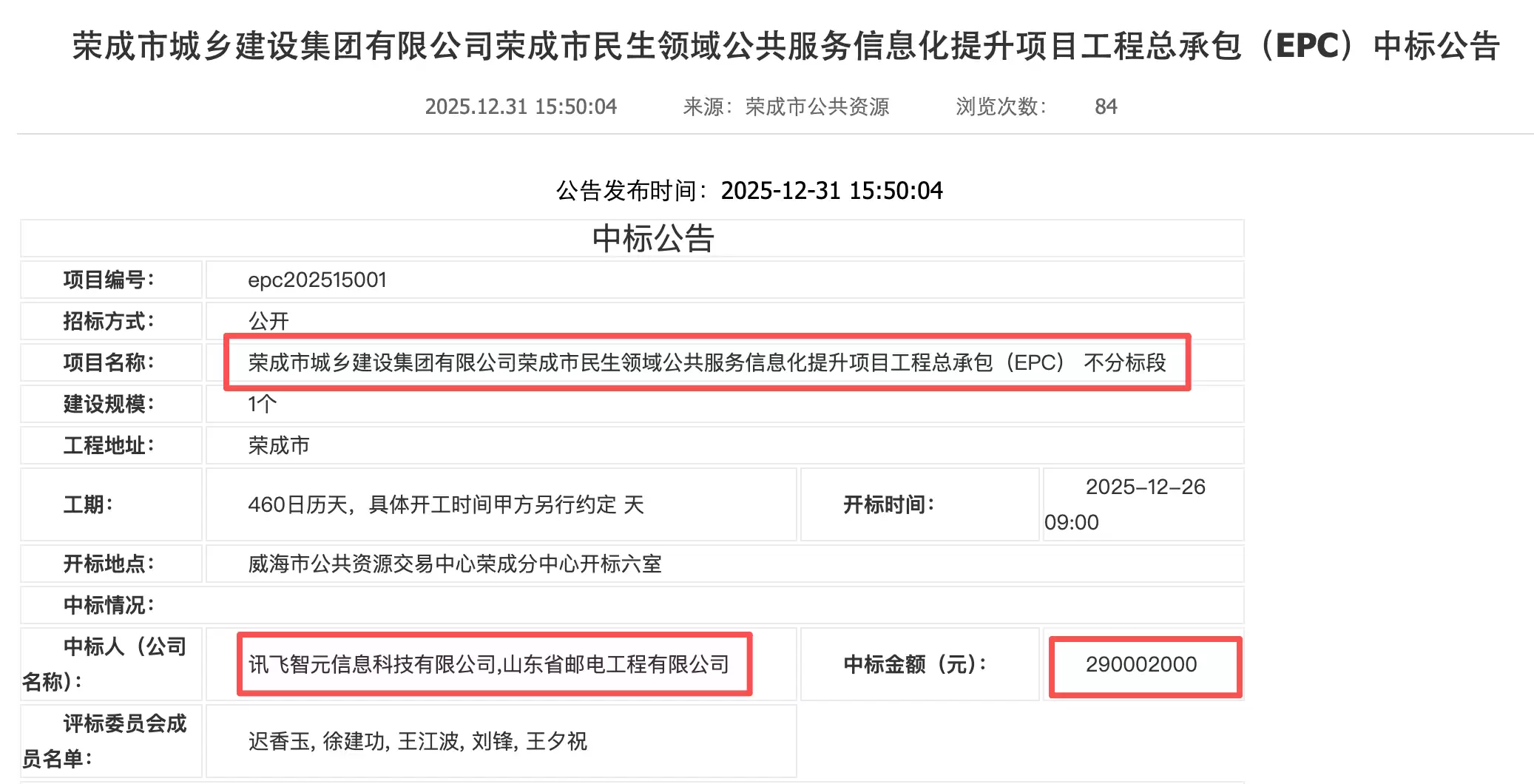 2025年12月31日,山东荣成市一项旨在提升民生服务质量的信息化项目正式公布中标结果。由科大讯飞子公司讯飞智元与山东省邮电工程有限公司组建的联合体成功中标,项目总金额高达2.9亿元。该项目致力于通过数字化手段,全面升级当地教育、医疗及文旅领域的公共服务能力。