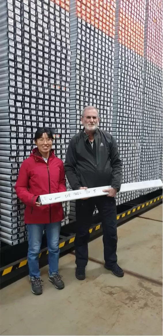 雅克·拉斯卡教授与武于靖博士后在德国不来梅岩心库合影,这里保存的大洋钻探项目岩心可用于重建轨道参数。