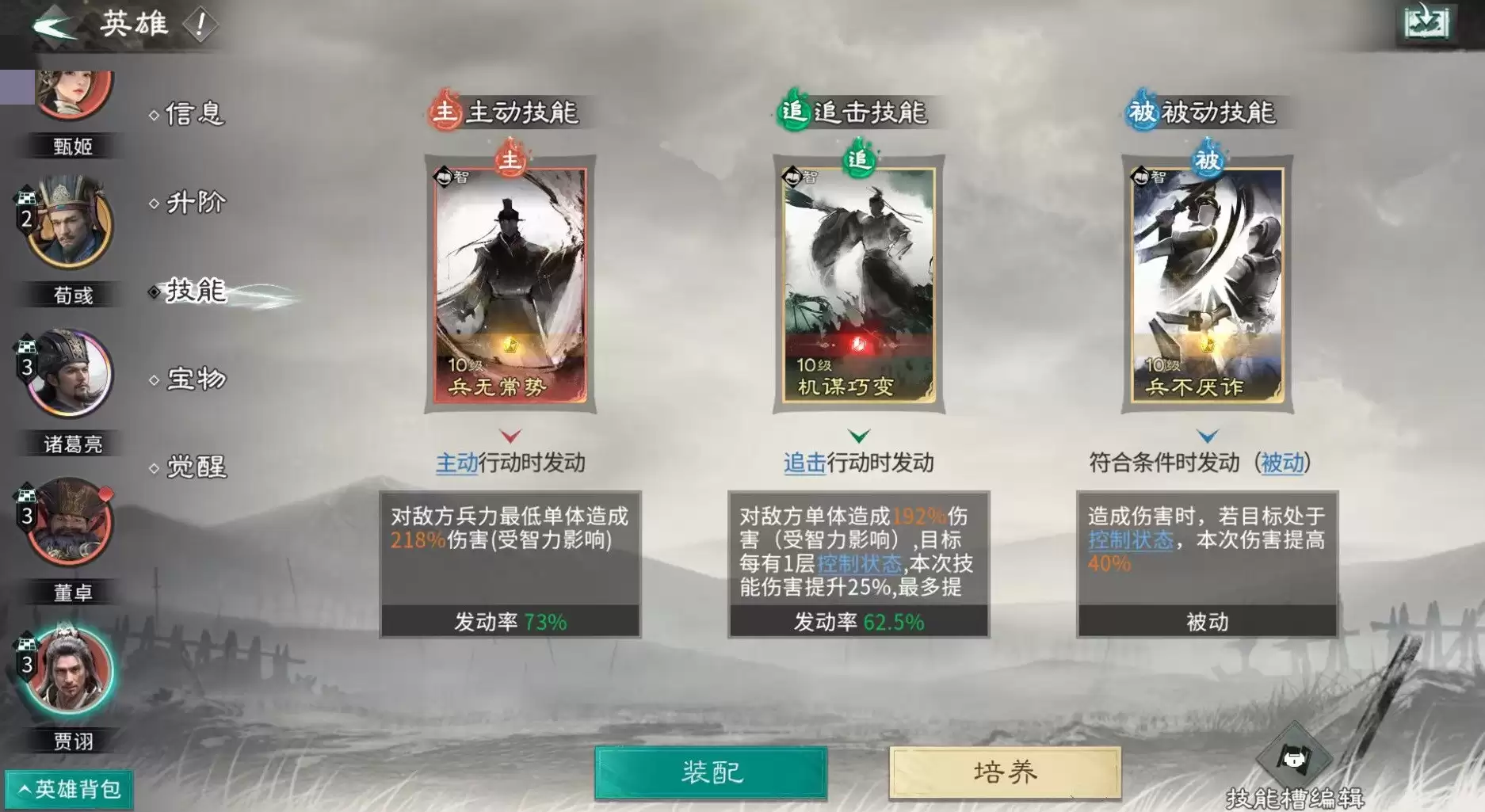 实战中,董卓通过天赋对随机敌方造成伤害并附加挑衅(属控制类状态),既触发贾诩天赋,又限制敌方集火方向;诸葛亮则在敌方行动后发动反击,进行智力比拼,胜者施加技穷(亦为控制状态),持续扩大控场覆盖面。在此基础之上,技能配置需严格服务于控制链闭环:诸葛亮携带机谋巧辩、反间计、兵不厌诈,强化智力压制与反制节奏;贾诩选用兵无常势、机谋巧辩、兵不厌诈,兼顾伤害补充与混乱覆盖率提升;董卓则配置首尾相援、擐甲厉兵,专注生存与嘲讽稳定性,主动规避追击类技能以保障前排站位完整性。
